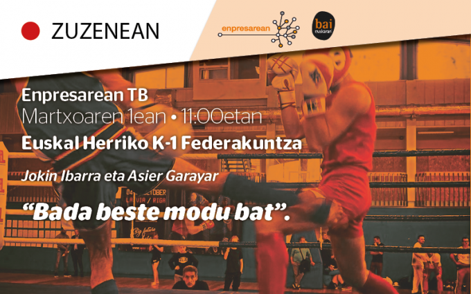 Euskal Herriko K-1 Kirol Elkarteko Jokin Ibarra eta Asier Garayar izan genituen joan den astean Enpresarean TB kanalean. K-1 borroka-kirolaren inguruko zehaztasunak eman zituzten eta kirol elkartea nola eta zergatik sortu duten ere bai. Nazi... Gehiago irakurri2019-02-27 - Enpresarean